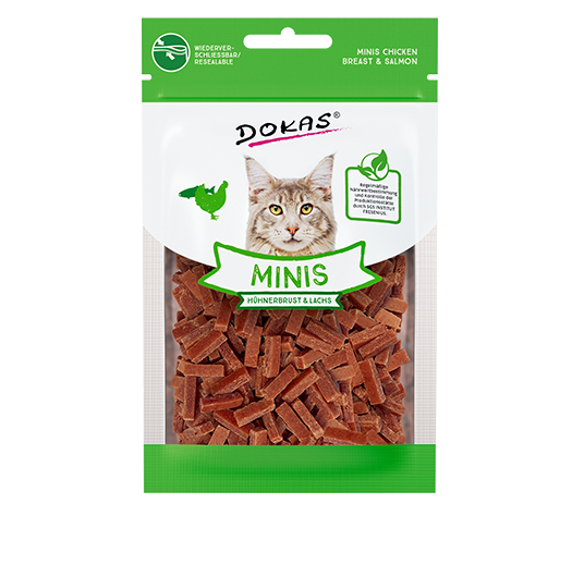Das Sortiment von DOKAS ist schnell erklärt: Wir machen Premium-Snacks für Hunde und Katzen. Doch die Liebe steckt bekanntlich im Detail. So auch bei uns. Deshalb legen wir größten Wert auf Qualität und Auswahl unserer Rohstoffe und eine schonende Verarbeitung. Unsere Sortimentsvielfalt zeichnet sich durch einen breites Spektrum vom schnellen Belohnungssnack bis hin zur knabberreichen Langzeitaufgabe aus. Da ist etwas für jeden Geschmack dabei. Alle Snacks sind im Frischebeutel mit transparentem Sichtfenster verpackt, damit sich der Tierliebhaber vor dem Kauf von Form, Größe und Qualität überzeugen kann.